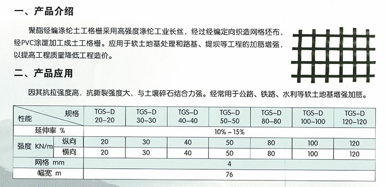 聚酯經(jīng)編滌綸土工格柵采用高強(qiáng)度滌綸工業(yè)長絲,經(jīng)過經(jīng)編定向織造網(wǎng)格坯布,經(jīng)PVC涂覆加工成土工格柵。應(yīng)用于軟土地基處理和路基、堤壩等工程的加筋增強(qiáng),以提高工程質(zhì)量降低工程造價(jià)。